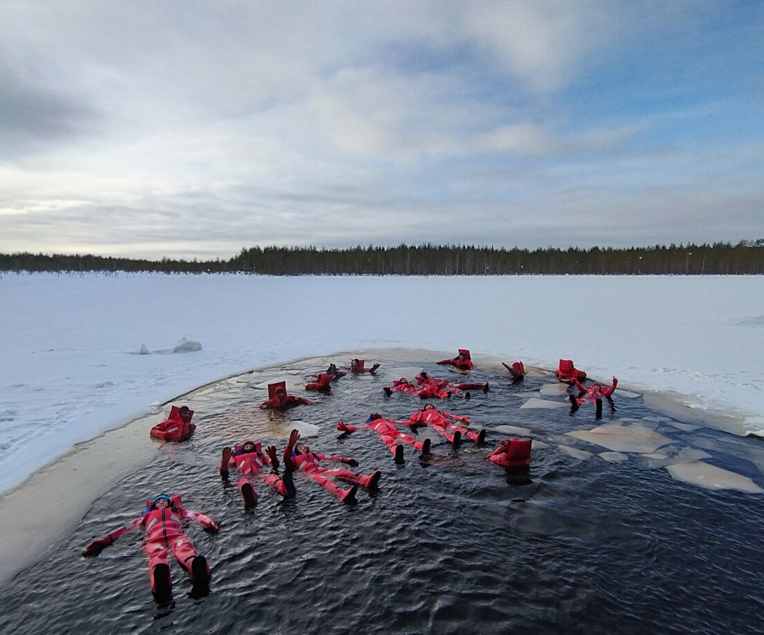 i oczywiście ice floating w finlandzkich wodach – czyli dryfowanie w lodowatym jeziorze, bez poczucia zimna, w szczelnych skafandrach.